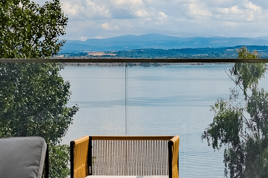 • Prywatny balkon, z którego można podziwiać widok na jezioro lub odpocząć z kubkiem kawy